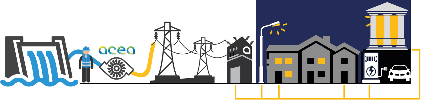 Produzione e distribuzione di elettricità: Acea produce energia principalmente presso centrali idroelettriche ed in via residuale tramite impianti termoelettrici a ciclo combinato (gas) e impianti fotovoltaici. Gli utenti ricevono l’energia elettrica grazie alla rete di distribuzione gestita e sviluppata da Acea. Lo sviluppo digitale e innovativo dei servizi, stimolato e richiesto da un mercato sempre più evoluto, impegna il Distributore ad orientarsi verso soluzioni in ottica di smart city. A ciò si accompagna una gestione resiliente delle reti con cui è possibile supportare il futuro spostamento e incremento degli usi del vettore elettrico.